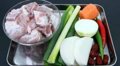 처음 단계은 핏물을 없애는 궤도입니다. 가장 먼저 돼지고기를 흐르는 물에 여러번 씻은후 물에 1시간 가량 담구어 핏물을 제거해요. 30분쯤 지나면 부유물이 떠오르니 물을 한 번 갈고 다시 30분동안 담급니다. 이 때에 설탕을 넣고 핏물을 제거하면 연육작용 때문에 고기가 좀더 부드러워져요. 핏물없앤 뒤 고기가 부드러워지면 살 부위에 잔칼집을 조금씩 내줘요. 핏물을 없애주는 시간동안 재료를 손질해 둡니다. 당근, 무, 감자는 껍데기를 깍은후 잘라주세요.