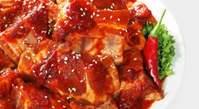 돼지갈비 1kg 물 4컵 마늘 10쪽 대파 1대 양파 하나 생강 1조각(약 20g) 청주 100ml 간장 100ml 고추장 100g 설탕 70g 굵은 고춧가루 2 큰술 참기름 1 큰술 후추 약간 깻잎, 청경채 등 장식용 채소(선택사항)
